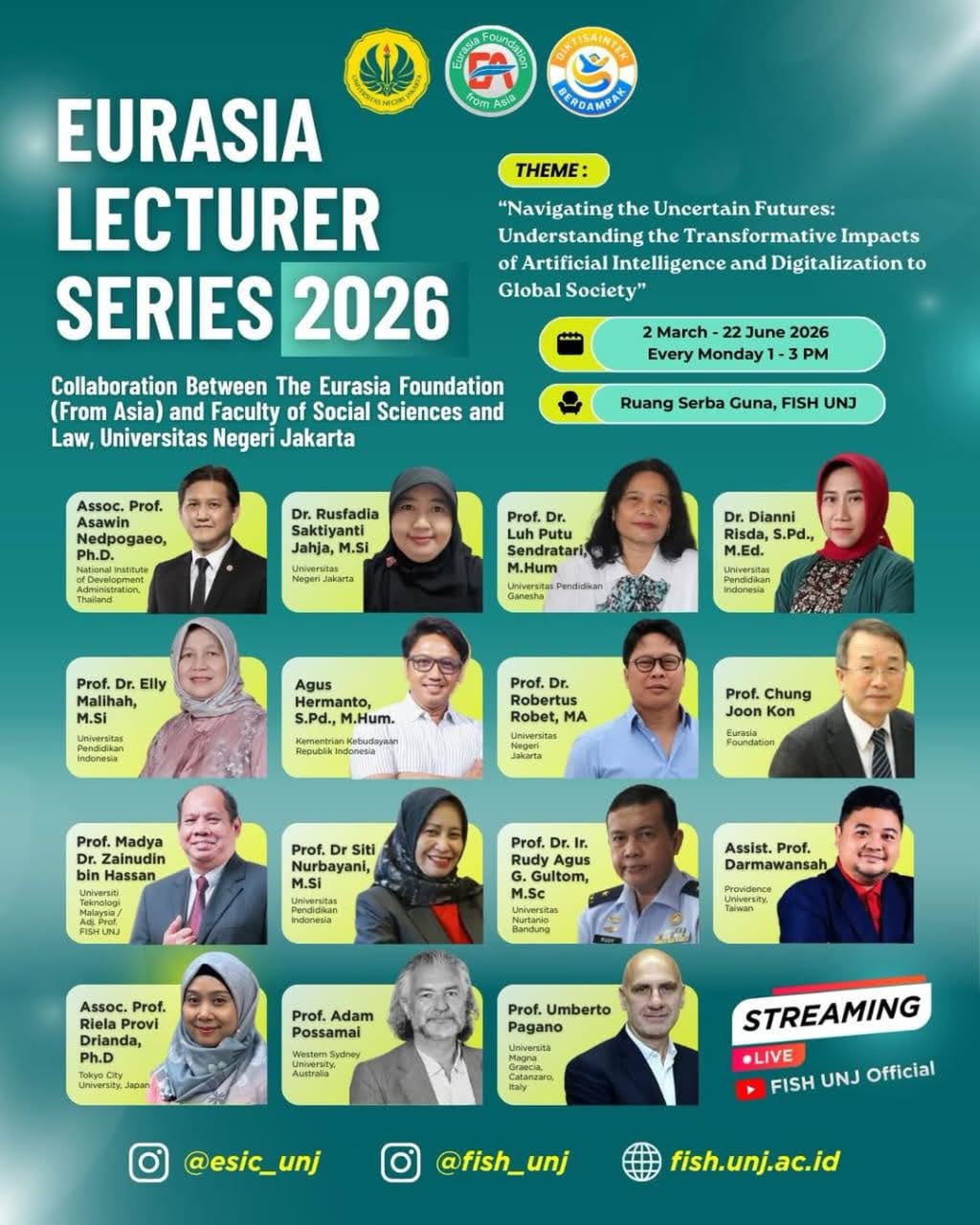 UNJ Eurasia 2026 menegaskan komitmen FISH UNJ untuk tidak sekadar mengikuti arus transformasi global, melainkan turut membentuk arah percakapan akademik internasional tentang kecerdasan buatan, digitalisasi, serta masa depan masyarakat. Kolaborasi lintas negara melalui Eurasia Lecturer Series 2026 membuktikan bahwa visi menjadi fakultas berkelas dunia yang unggul, kompetitif, serta berkarakter diwujudkan melalui jejaring nyata, dialog ilmiah kritis, serta kontribusi pada pencapaian SDGs. Forum ini memperlihatkan bahwa pendidikan ilmu sosial serta hukum memiliki peran strategis memastikan transformasi teknologi tetap berorientasi pada kemanusiaan, keadilan, serta keberlanjutan global. UNJ Eurasia 2026: Kolaborasi Global Menjawab Tantangan Transformasi Digital Program Eurasia Lecturer Series 2026 menjadi momentum strategis bagi Fakultas Ilmu Sosial dan Hukum Universitas Negeri Jakarta (FISH UNJ) dalam memperkuat jejaring akademik lintas kawasan Asia–Eropa. Kolaborasi antara Eurasia Foundation (from Asia) bersama FISH UNJ menghadirkan forum intelektual berskala internasional bertajuk “Navigating the Uncertain Futures: Understanding the Transformative Impacts of Artificial Intelligence and Digitalization to Global Society.” Kegiatan ini berlangsung setiap Senin, 2 Maret hingga 22 Juni 2026, bertempat Ruang Serba Guna FISH UNJ serta disiarkan langsung melalui kanal resmi FISH UNJ. UNJ Eurasia 2026 menghadirkan akademisi ternama lintas negara seperti Thailand, Malaysia, Jepang, Australia, Italia, Korea, Taiwan, serta berbagai universitas terkemuka Indonesia. Kehadiran para profesor, associate professor, hingga praktisi kebijakan publik menghadirkan perspektif multidisipliner terkait kecerdasan buatan, transformasi digital, tata kelola global, pendidikan, komunikasi, hingga isu sosial kontemporer. Forum ini tidak sekadar ceramah akademik, melainkan ruang dialog reflektif guna memetakan masa depan masyarakat global yang semakin terdigitalisasi. Transformasi digital menghadirkan peluang sekaligus risiko. Perubahan lanskap kerja, redefinisi otoritas pengetahuan, krisis etika algoritmik, hingga disrupsi relasi sosial menjadi isu krusial abad ke-21. Melalui UNJ Eurasia 2026, diskursus akademik diarahkan bukan hanya pada aspek teknis AI, melainkan juga implikasi sosial, hukum, budaya, serta dimensi kemanusiaan. Pendekatan ini sejalan karakter FISH UNJ sebagai fakultas ilmu sosial serta hukum yang menempatkan manusia sebagai pusat transformasi. Kontribusi terhadap SDGs serta Penguatan Jejaring Akademik Global Keterkaitan UNJ Eurasia 2026 terhadap Sustainable Development Goals (SDGs) tampak jelas pada beberapa tujuan utama. SDG 4 tentang Quality Education terefleksikan melalui akses pembelajaran internasional bagi mahasiswa serta dosen FISH UNJ. Interaksi langsung bersama akademisi mancanegara memperkaya wawasan global, meningkatkan literasi digital, serta mendorong kultur akademik berbasis riset kolaboratif. SDG 9 tentang Industry, Innovation and Infrastructure tercermin pada diskusi inovasi teknologi serta transformasi institusi pendidikan menghadapi era AI. SDG 16 mengenai Peace, Justice and Strong Institutions hadir melalui pembahasan tata kelola digital, etika kecerdasan buatan, serta regulasi global. Komitmen tersebut menguatkan Visi FISH UNJ: menjadi fakultas berkelas dunia yang unggul, kompetitif, serta berkarakter dalam bidang pendidikan ilmu sosial, ilmu-ilmu sosial, serta ilmu hukum. Keunggulan akademik dibangun melalui transfer pengetahuan lintas negara. Daya saing diperkuat melalui jejaring internasional Eurasia Foundation. Karakter akademik dibentuk melalui diskusi etis mengenai dampak sosial teknologi. Forum ini juga menjadi langkah konkret internasionalisasi kampus. Publikasi bersama, peluang riset kolaboratif, mobilitas akademik, hingga penguatan reputasi institusi menjadi potensi turunan jangka panjang. Mahasiswa memperoleh kesempatan berdialog langsung bersama pakar global, membuka horizon berpikir kritis terkait masa depan pekerjaan, kebijakan publik, keamanan digital, serta transformasi komunikasi global. Keberadaan pembicara lintas disiplin menunjukkan bahwa isu AI bukan sekadar domain teknik, melainkan wilayah interdisipliner yang menyentuh hukum, kebijakan publik, komunikasi, budaya, pendidikan, serta pembangunan sosial. Perspektif Asia–Eropa memperkaya pendekatan Global South sekaligus membuka ruang refleksi kritis terhadap ketimpangan digital global. UNJ Eurasia 2026 menjadi simbol keberanian akademik FISH UNJ menavigasi masa depan tak pasti. Tantangan disrupsi teknologi tidak direspons secara reaktif, melainkan melalui forum ilmiah terstruktur berbasis dialog internasional. Strategi ini memperlihatkan komitmen nyata menuju fakultas berkelas dunia, bukan sekadar slogan, tetapi melalui praktik kolaboratif konkret. Arah masa depan pendidikan ilmu sosial tidak dapat dilepaskan dari transformasi digital. Forum Eurasia Lecturer Series 2026 memperlihatkan bahwa FISH UNJ menempatkan diri sebagai aktor aktif percakapan global. Jejaring Eurasia membuka ruang pembelajaran lintas budaya, lintas kebijakan, serta lintas perspektif. UNJ Eurasia 2026 bukan hanya agenda akademik semesteran. Program ini merupakan investasi reputasi, kualitas, serta visi global FISH UNJ menuju 2045. Upaya tersebut mempertegas posisi FISH UNJ sebagai pusat keilmuan sosial serta hukum yang adaptif, reflektif, serta berorientasi pada pembangunan berkelanjutan (NHI/ENP). Share this article Pencarian More than 2 results are available in the PRO version (This notice is only visible to admin users) Kategori Berita Berita (458) Internasionalisasi (33) Kemahasiswaan (17) Penelitian (8) Pengabdian (10) Pengajaran (23) Pengumuman (3) Penjaminan Mutu (36) Prestasi (5) Prodi (19) Program Unggulan (34) Tak Berkategori (12) Tata Kelola (21) Zona Integritas (3) Berita Terbaru