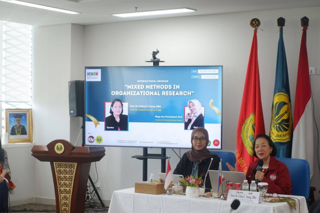 Pada sesi pertama, peserta mengikuti pemaparan bertajuk “Mixed Methods in Organizational Research” yang disampaikan oleh Prof. Dr. Felina C. Young, DBA dan dimoderatori oleh Mega Ayu Permatasari, M.Si. Dalam sesi ini, Prof. Young menekankan bahwa riset kini bukan lagi sekadar pilihan, melainkan tuntutan utama dalam dunia akademik global.