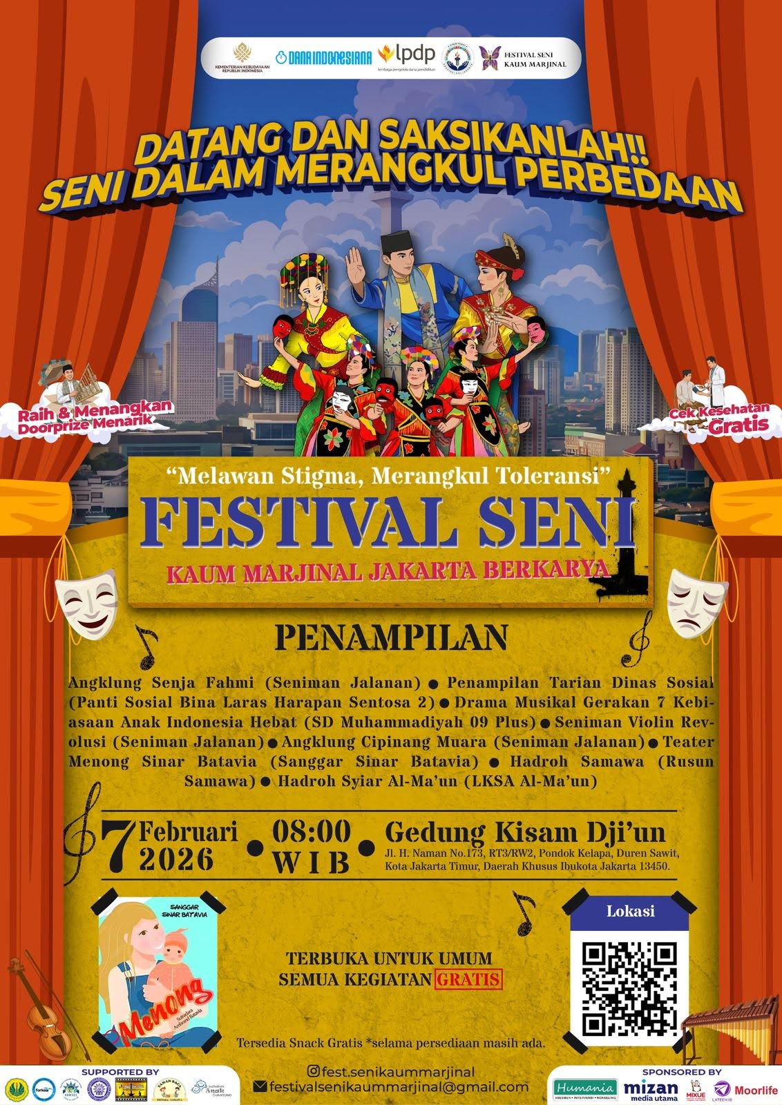 Jakarta, 7 Februari 2026 – Festival Seni Kaum Marjinal Jakarta Berkarya 2026 bertema “Melawan Stigma, Merangkul Toleransi” sukses digelar di Gedung Kisam Dji’un, Jakarta Timur, dengan dukungan sejumlah lembaga termasuk Universitas Negeri Jakarta (UNJ). Kegiatan ini menjadi ruang ekspresi bagi komunitas marjinal untuk menampilkan bakat, kreativitas, dan potensi seni mereka, sekaligus memperkuat pesan inklusivitas di ruang publik.