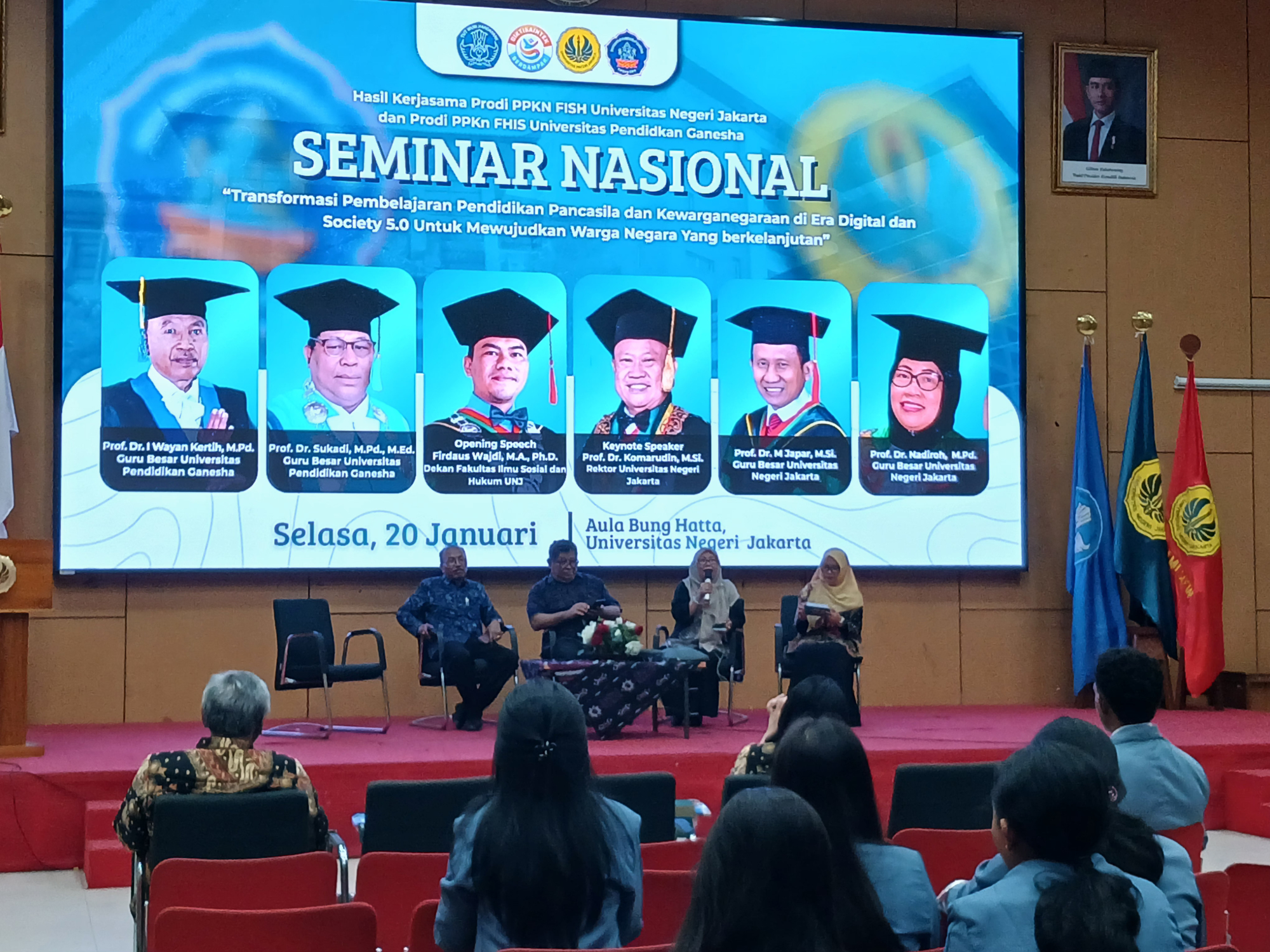 Seminar Nasional bertajuk “Transformasi Pendidikan Pancasila dan Kewarganegaraan di Era Digital dan Society 5.0 untuk Mewujudkan Warga Negara yang Berkelanjutan” terselenggara Selasa, 20 Januari 2026, Aula Bung Hatta, Universitas Negeri Jakarta. Kegiatan akademik nasional ini menjadi momentum penguatan kolaborasi antarlembaga pendidikan tinggi melalui penandatanganan Implementation Agreement (IA) antara Program Studi PPKN UNJ serta Program Studi PPKN Universitas Pendidikan Ganesha (Undiksha).